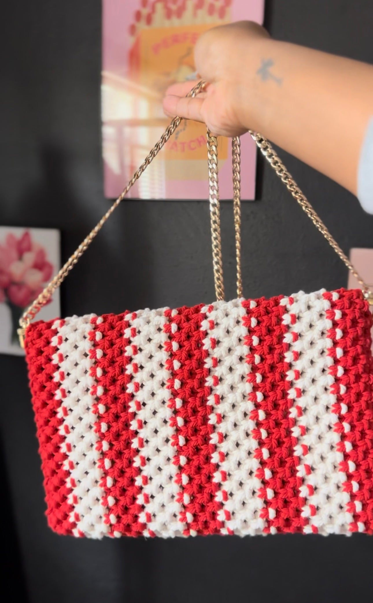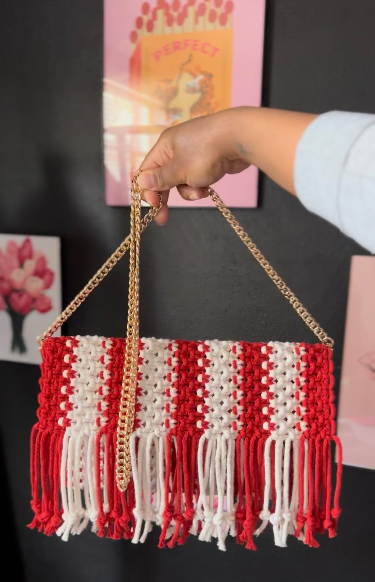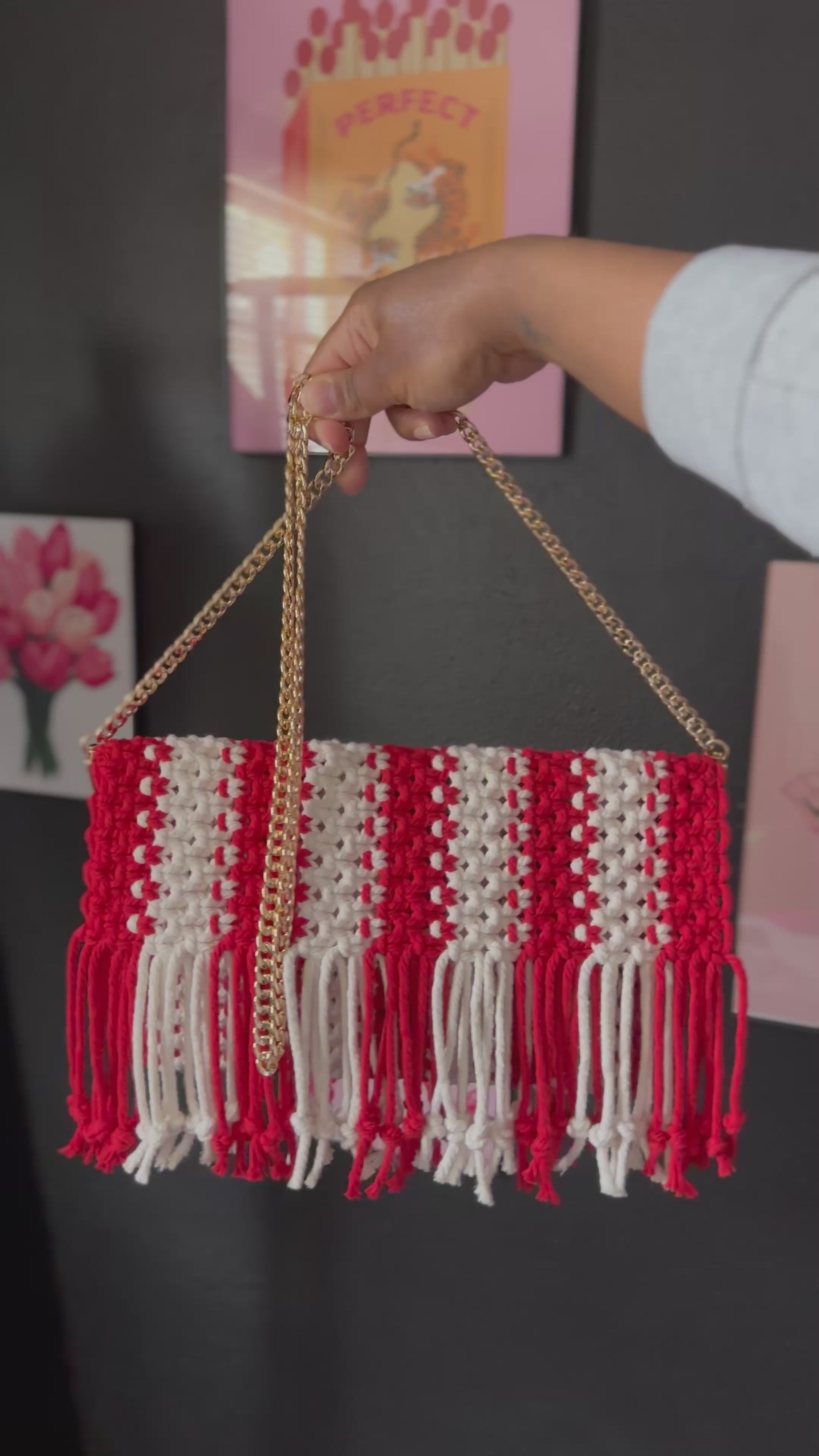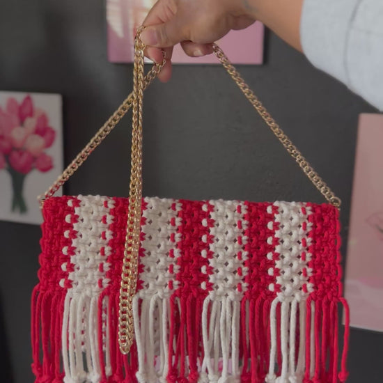 Sleek red and white macramé clutch with fringe detailing, finished with a chic gold chain. A sweet pop of style, perfect for holiday outings.